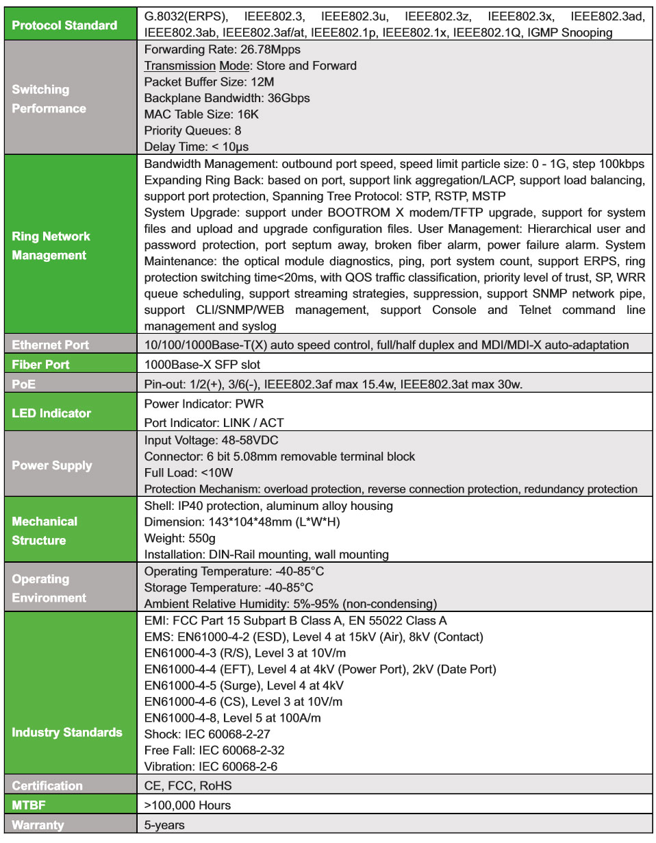 - Support G.8032(ERPS), IEEE802.3, IEEE802.3u, IEEE802.3z, IEEE802.3x, IEEE802.3ad, IEEE802.3ab, IEEE802.3af/at, IEEE802.1p, IEEE802.1x, IEEE802.1Q, IGMPSnooping.