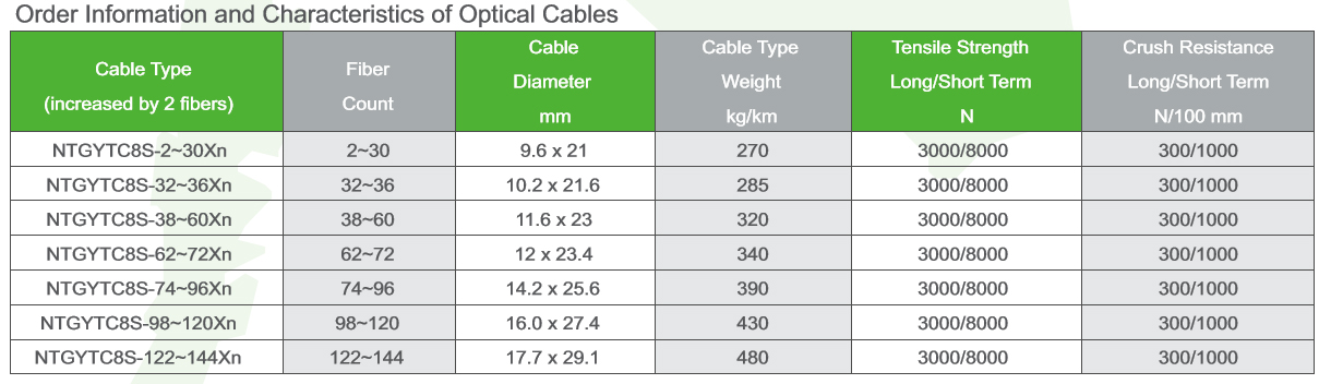 In the Nitrotel GYTF8S cable, single-mode/multimode fibers are positioned in the loose tubes, which are made of high modulus plastic, while the loose tubes strand together around metallic central strength member into a compact and circular cable core, and the water-blocking yarns are distributed into interstices of it. After a PSP is applied around the cable core, this part of cable accompanied with the stranded wires as the supporting part are completed with a HDPE sheath to be a figure-8 structure. This kind of cable is specifically used for self supporting aerial installation.