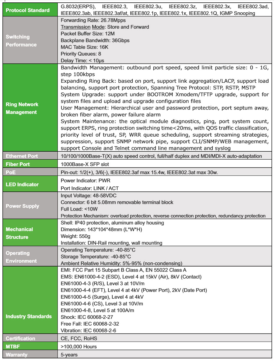 - Support G.8032(ERPS), IEEE802.3, IEEE802.3u, IEEE802.3z, IEEE802.3x, IEEE802.3ad, IEEE802.3ab, IEEE802.3af/at, IEEE802.1p, IEEE802.1x, IEEE802.1Q, IGMP Snooping.