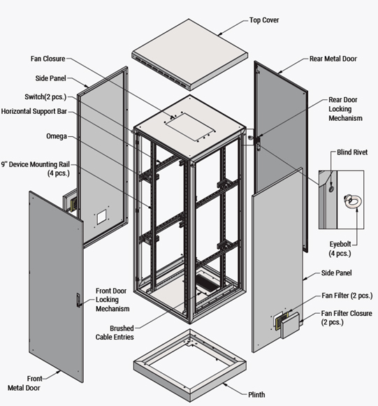 Comes with 19” double rails, in 22 to 42U, width 600 or 800 mm, depth 600, 800, or 1000mm