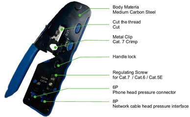 The Nitrotel crimping modular plugs RJ45 in parallel action, cuts, strips, and crimps modular plugs without changing modular (DIE) set. Smooth ratcheting mechanism ensures positive connections. Middle carbon steel frame, harden & black oxide finished, lightweight, durable and compact. Strips round cables