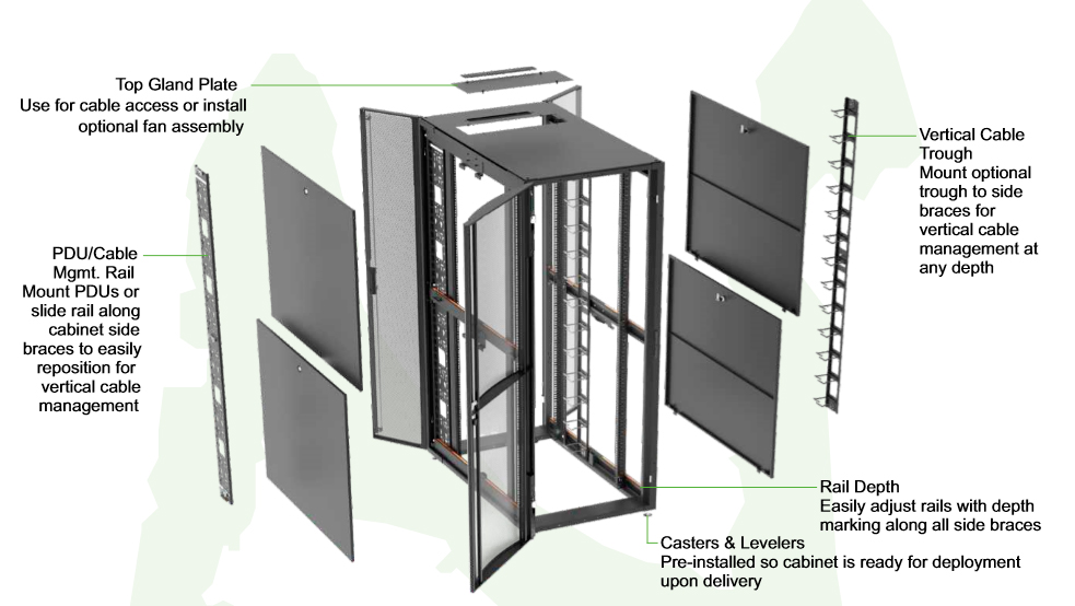 - Two vertical bars fixed in each of the rear corners to be utilized as cable managers or mounting of PDUs and Vertical Cable Troughs