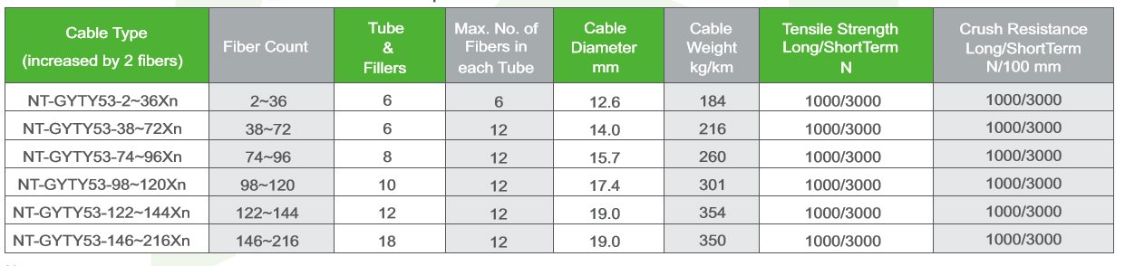 In the Nitrotel GYTY53 cable, single-mode/multimode fibers are positioned in the loose tubes, which are made of high modulus plastic materials, while the loose tubes strand together around metallic central strength member into a compact and circular cable core. For certain high fiber count cables, the strength member would be covered with polyethylene (PE). The water blocking materials are distributed into interstices of the cable core. The cable core is covered with a PE inner sheath, and the PSP is longitudinally applied around the cable core before a HDPE outer sheath is extruded over it